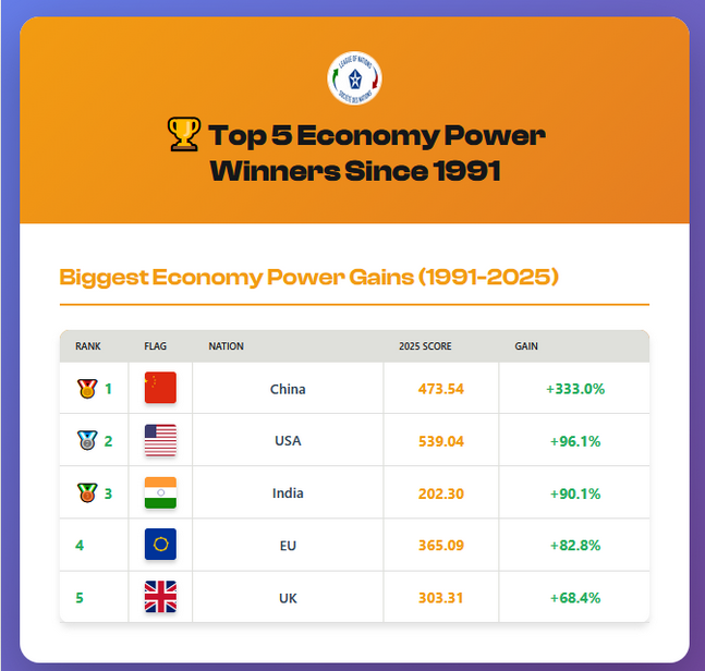 The Economy League is unforgiving. The winners—USA, China, India—control scale and dominate the table. The losers—UK, France, Germany, Japan—lack scale and fade from the top tier. The multiplier effect is brutal: moderate scale × moderate quality × moderate discipline = moderate power. It rewards balance and punishes fatal weaknesses. And in a world dominated by continental economies, moderate power is irrelevance.