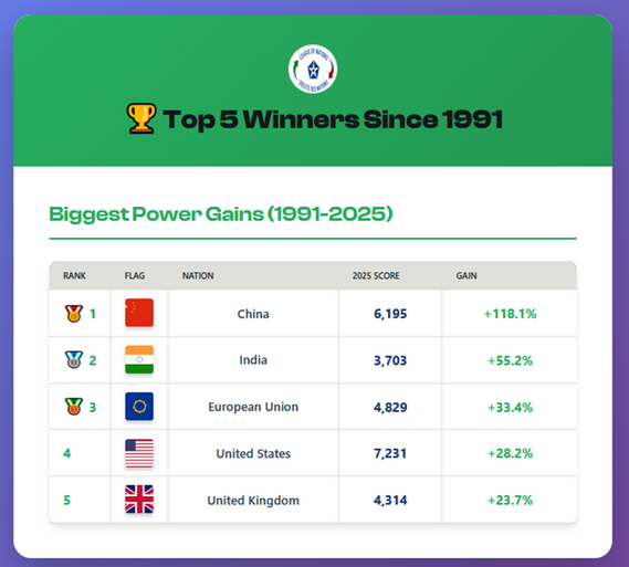 - China (473.54) - Only 66 pts behind USA | +333% since 1991 ⚡