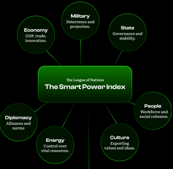 These form your national Smart Power Score, ranking you in the League of Nations and Smart Power Leagues. It's transparent, automated, and impossible to fake. No opinion. No ideology. Just numbers.