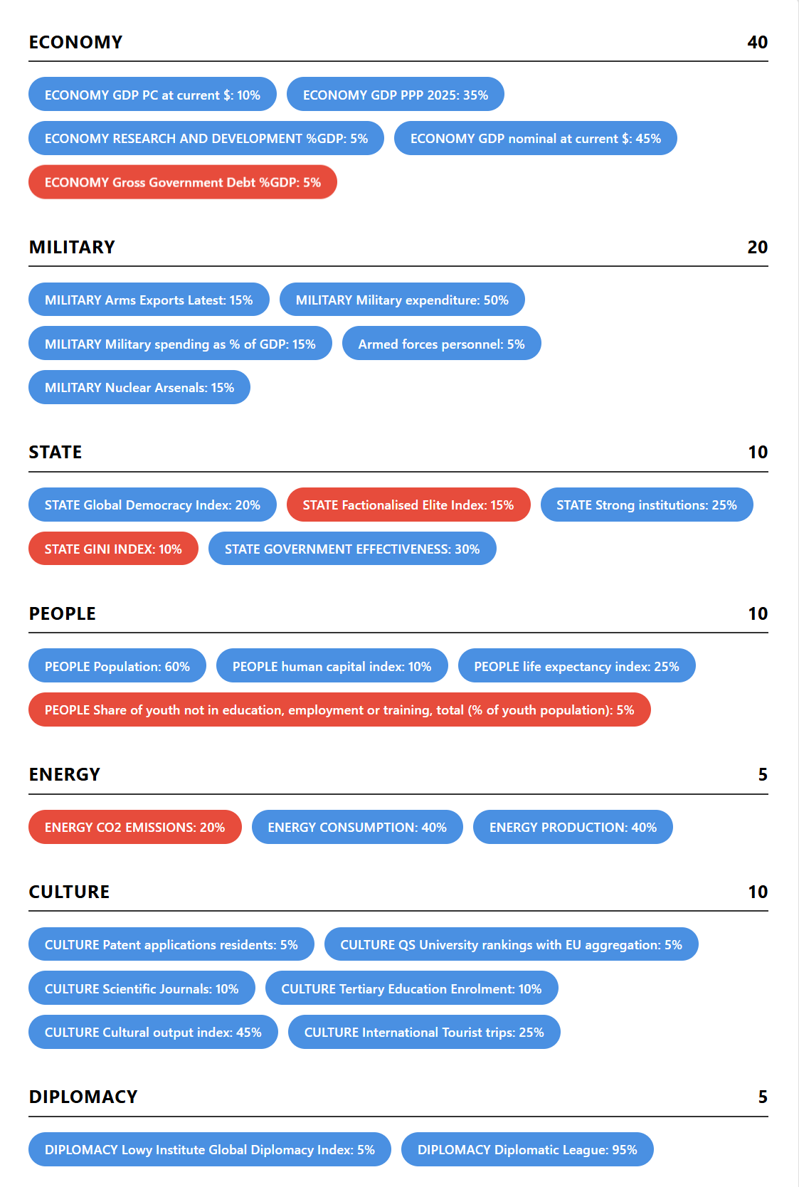Since 1991, we've tracked 168 states across 30 games in seven leagues of power —Economy, Military, State, People, Energy, Culture, and Diplomacy— seeing how smart as well as strong they are - measuring their Smart Power scores with the precision of expected goals (xG) and possession statistics.