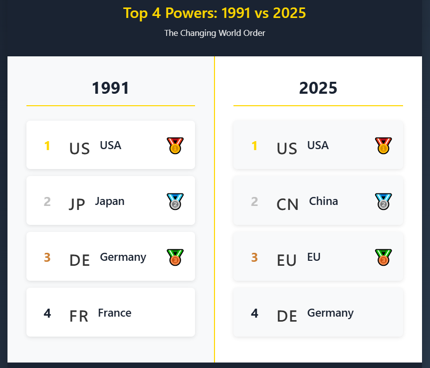 The defining winner of the post-Cold War era. China executed the most ruthless, focused grand strategy in modern history. While others debated, China built. While others globalised, China weaponized globalisation. From 10th place to 2nd in a generation.